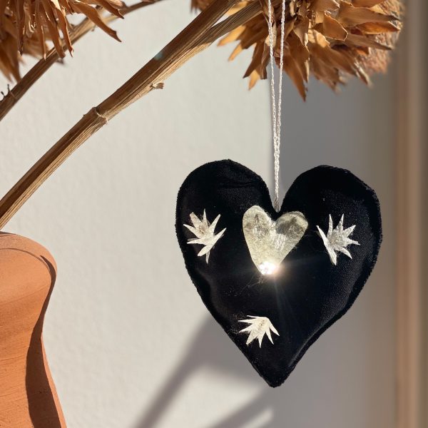 bejewelled and embroidered onto black cotton velvet heart cushion with a crochet chain stitch string loop.